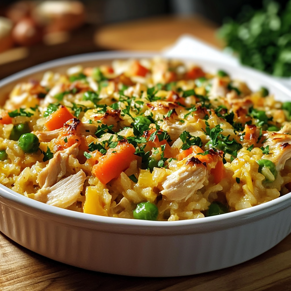 What makes it irresistible? Think of the chicken’s softness melting into the creamy base, the rice plump with savory flavor, and the vegetables brightening everything up with earthy sweetness. The cheese topping adds a touch of decadence that doesn’t feel heavy. Best of all, it feeds a crowd: six generous servings make it ideal for weekend gatherings or leftovers for work lunches. No fancy tools or techniques—just a mixing bowl and your reliable old oven.